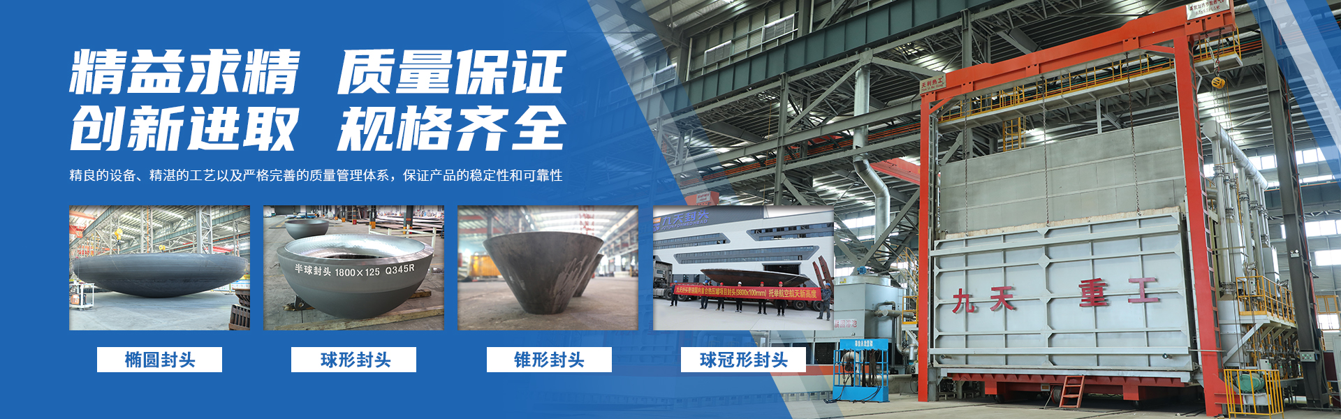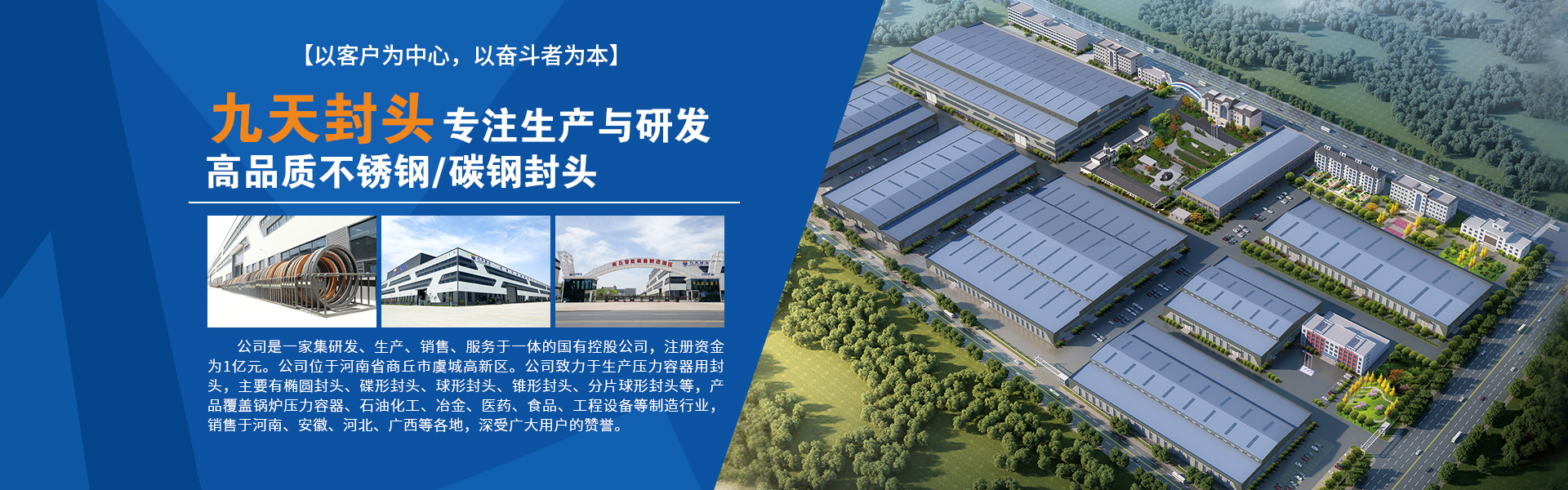 河南九天封頭制造有限公司是一家集研發、生產、銷售、服務于一體的國有控股公司,注冊資金為1億元。公司座落于河南省商丘市虞城縣高新技術開發區,南北相臨京九鐵路、濟廣高速,東西有連霍高速、隴海鐵路穿境而過,位置優越交通極為便利。 公司主要設備有600T—36000T的雙動壓機各1臺,3.5米—14.5米的旋壓機組各1套,6000W—30000W激光下料機6臺,6米、8米的等離子焊機及1米、1.6米、2.6米、5米的立車各1臺。龍門式20000W三維激光切割機...